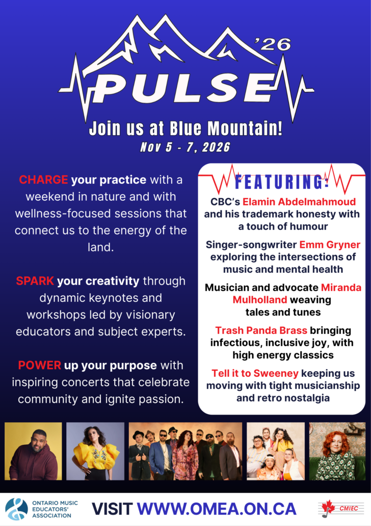 Pulse 2026 is OMEA’s next provincial conference — a gathering dedicated to embracing the heartbeat of music in our classrooms, communities, and shared musical lives. Music is more than sound; it is a pulse that moves us, connects us, and shapes how we learn, create, and belong.