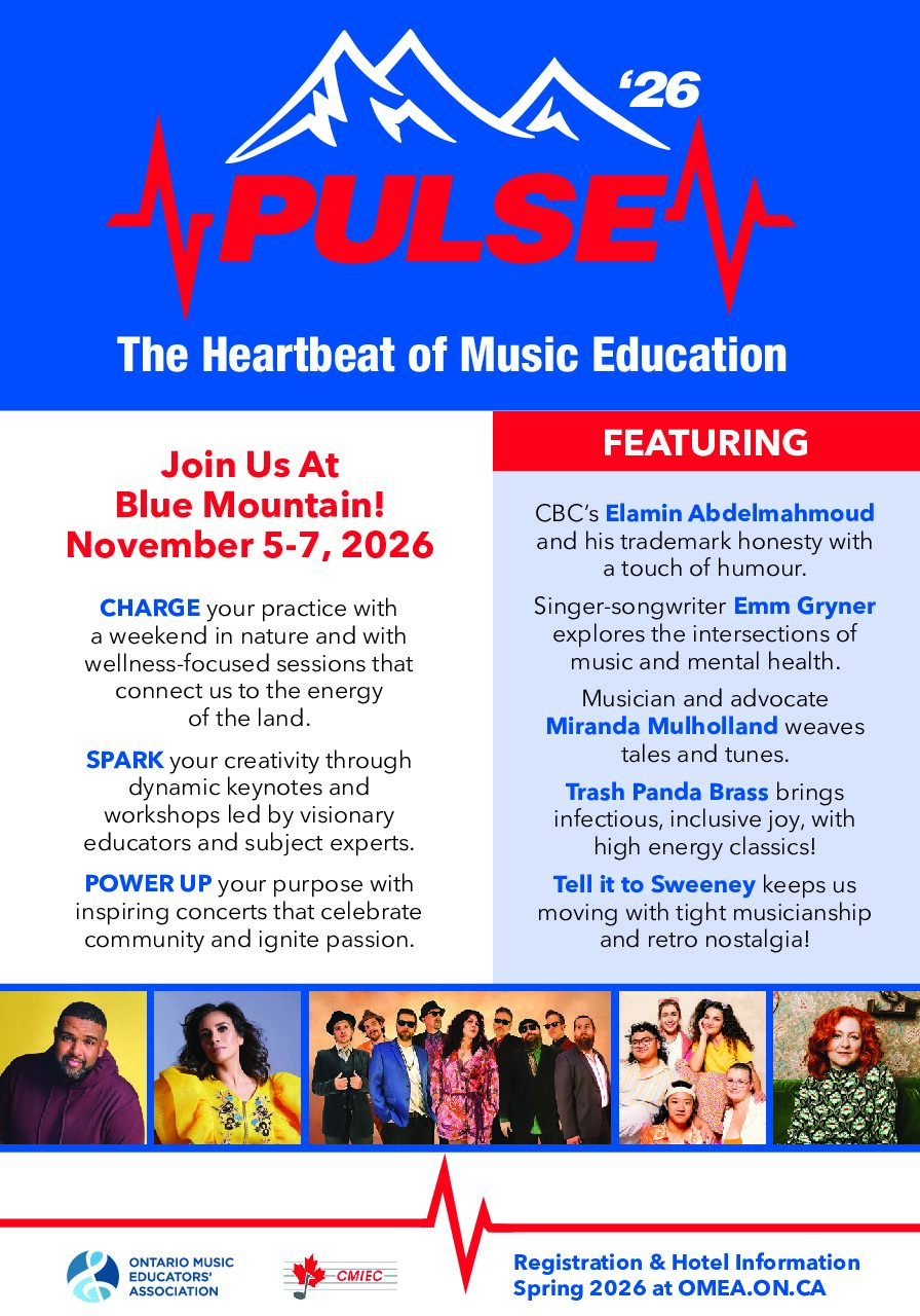 Pulse 2026 is OMEA’s next provincial conference — a gathering dedicated to embracing the heartbeat of music in our classrooms, communities, and shared musical lives. Music is more than sound; it is a pulse that moves us, connects us, and shapes how we learn, create, and belong. At Pulse 2026, we’ll explore how this pulse beats uniquely in each student, resonating across genres, traditions, identities, and personal stories. Through thoughtful, responsive, and inclusive practice, we aim to build music education spaces that are alive with possibility and grounded in Anti-Oppressive and Anti-Colonial approaches.